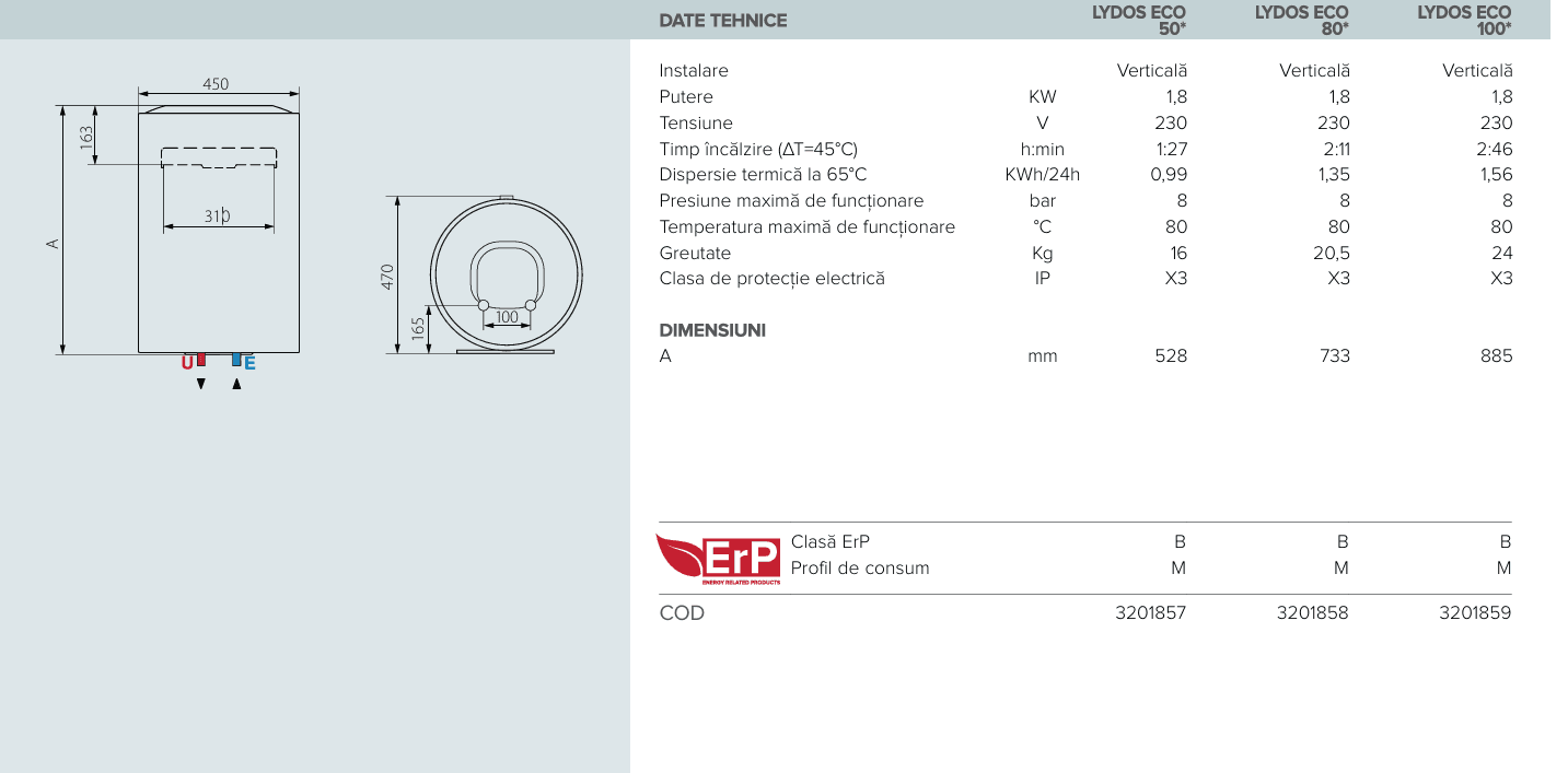 Capacități: 50 L, 80 L, 100 L
