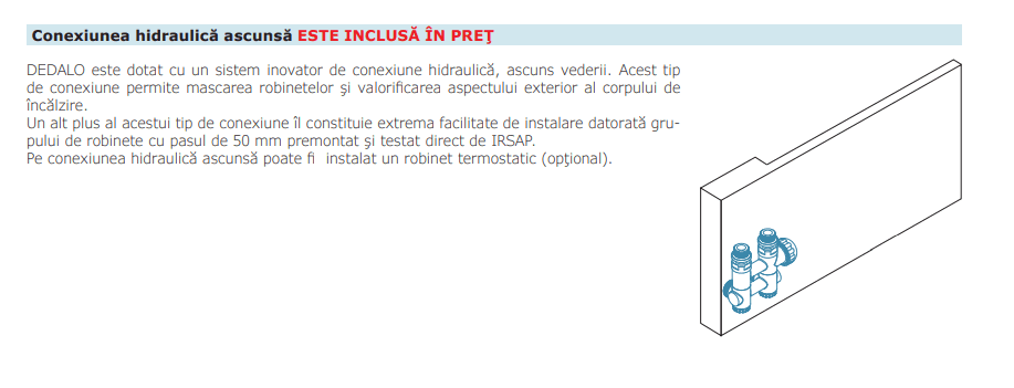 sistem inovator de legătură hidraulică ascunsă, instalat peprodus, prevăzut cu racorduri pentru branșare cu tuburi din cupru (diametre 12, 14, și 15 mm) i multistrat (14 gros. 2 și 16 gros. 2)